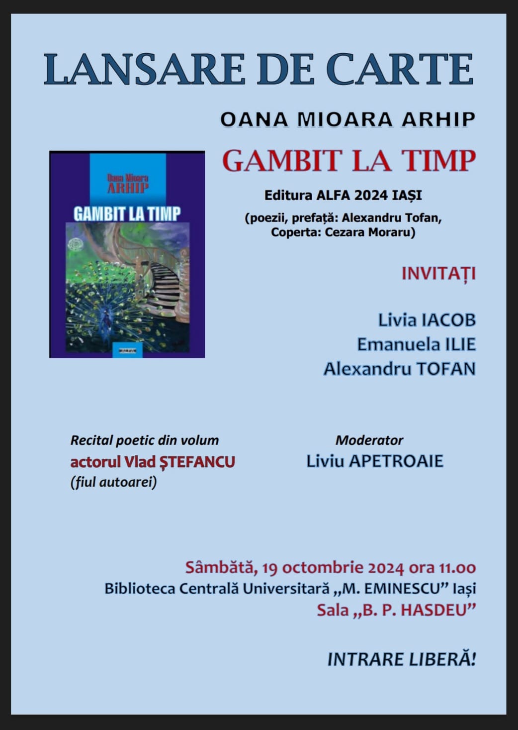 În ziua de sâmbătă, 19 octombrie 2024, începând cu ora 11, va fi lansată cartea Gambit la timp (poezii, prefață: prof. univ. Alexandru Tofan; coperta Cezara Moraru).